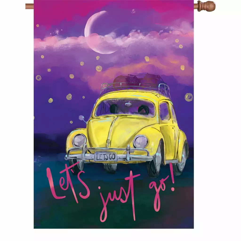 Flag shows a Volkswagen Beetle and fireflies on a star-lit night and reads: Let’s just go!