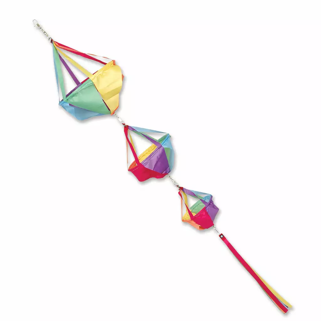 These fabulous Spinnies, long popularized by Catch the Wind, are now proud members of the Premier family of wind products. Beautiful and energetically playful, whether flown from poles, porches or parafoils. Spinnies come in four different sizes, Small, Large, Jumbo and Deluxe, with each successive Spinnie designed to turn in the opposite direction of its neighbor for best visual effect. Each set is complete with a set of matching 24 inch streamer tails.